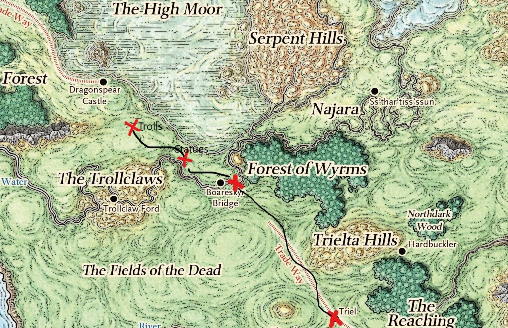 The Journey began in the Western Heartlands at the village of Triel, after leaving the safety of the heavily traveled Trade Way the party decided to skirt to the west of the ominously named ‘Forest of Wyrms’. The first encounter with a band of brigands was just South of the Boareskyr Bridge’ about 100 miles into the journey. Next the crew encountered two Weeping Angels and then a trio of Trolls, around 150 miles travelled from start.
